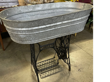 Large galvanized tub mounted to antique sewing machine base. (2 available)